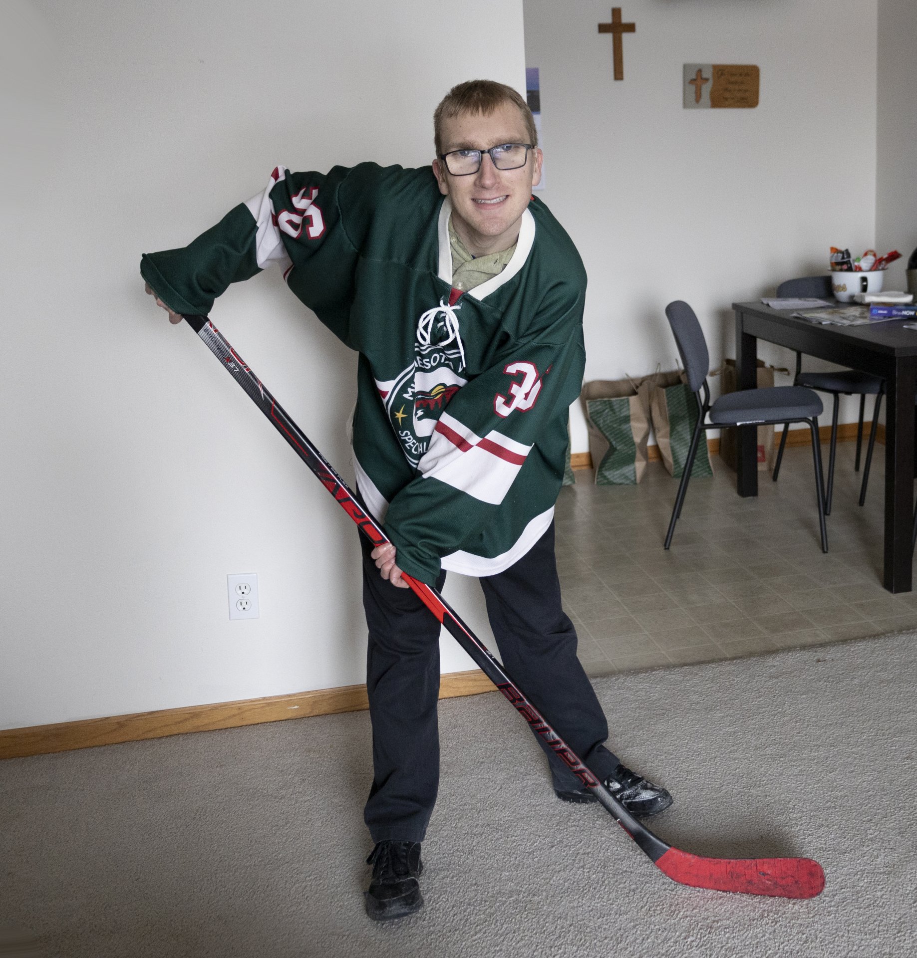 When he’s not working, Justin likes watching any and all sports. He does a lot of Special Olympics and every season he’s in a different sport. He’s very proud of the fact that he can play ice hockey and wear the full gear. He’ll tell you that he skates as fast as the Wild players. When he was in grade school, Justin would walk down the hall with his head down not engaging; no eye contact. But when he started playing for Minnesota Special Hockey it put him on the same level as the rest of the kids. He started to say “Hi” to people in the halls and it just blew his confidence out of the water. It was awesome.